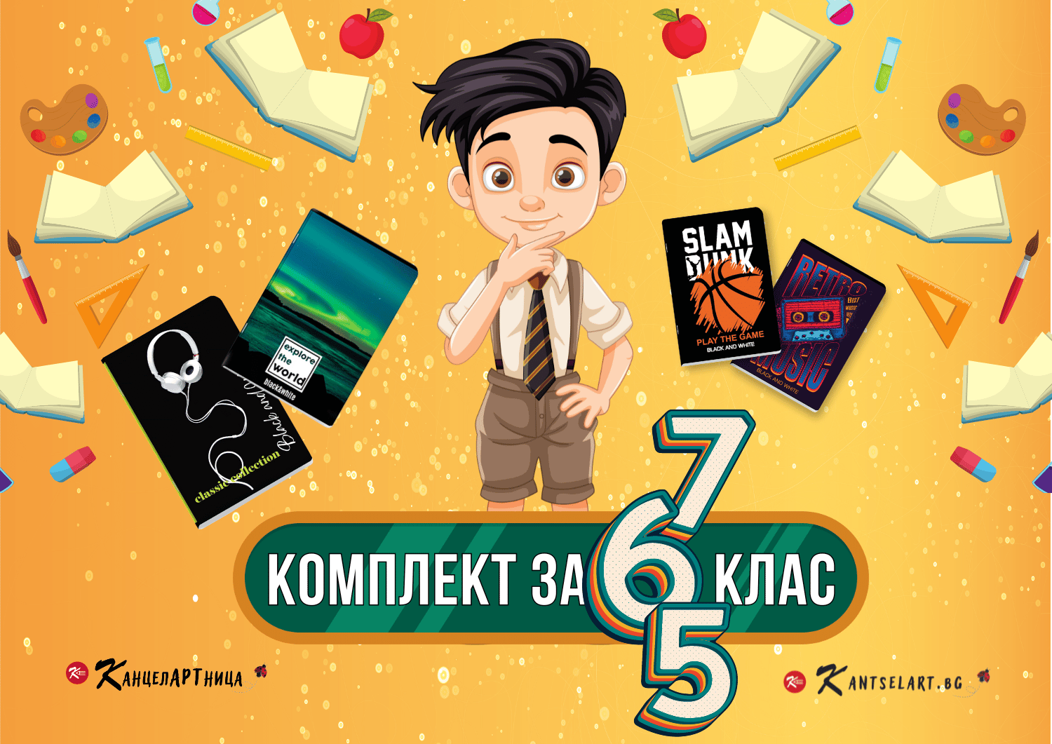 Комплектът за прогимназиален етап, съдържа подбрани качествени пособия и е вариант с тетрадки А5 и А4 формат с телчета в кутия. Предлагаме вариант с тетрадки със спирали.