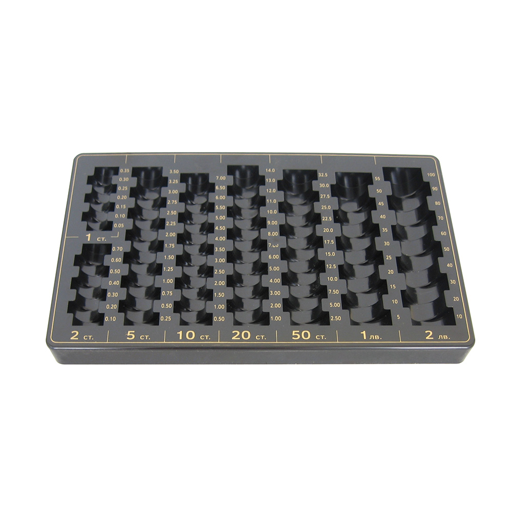 за сортиране на всички видове български монети<br>със скала за броене на наличностите<br></p>